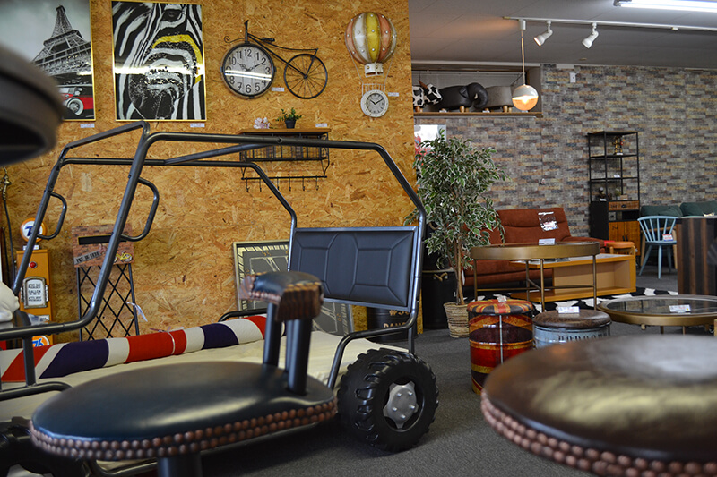 大川家具や有名ブランドの家具を展示し、スタッフが厳選した、海外輸入雑貨を中心に取り揃えております。アロマ・ブリキ雑貨・アートパネルなど、室内をおしゃれに飾るアイテムがお客さまをお待ちしております。